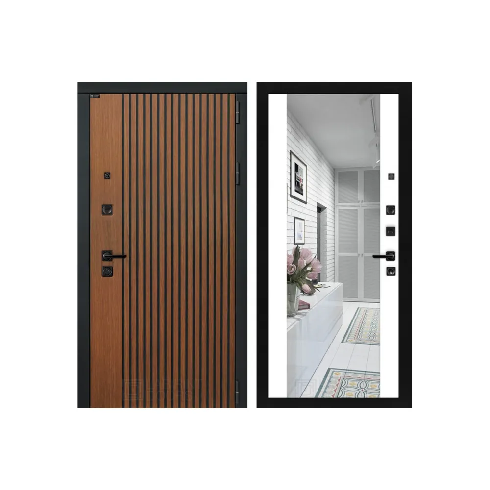Фурнитура в черном цвете: Броненакладка врезная, накладка со шторкой, глазок , дверная ручка, ночная задвижка. Цилиндр ключ-вертушка Guardian, регулируемый эксцентрик.